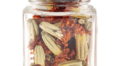 메리골드 꽃송이에 붙어있는 진딧물이나 불순물들을 없애기 위해 식초물에 3~4분 정도 담갔다가 건져줘요. 건진 꽃봉오리는 건조기 채반에 꽃을 펼쳐서 널어 건조기로 말려줘요. 1차로 말린 꽃을 살짝 쪄줍니다. 살짝 찐 꽃을 건조기에서 2차로 말려주면 메리골드 꽃차가 완성돼요.